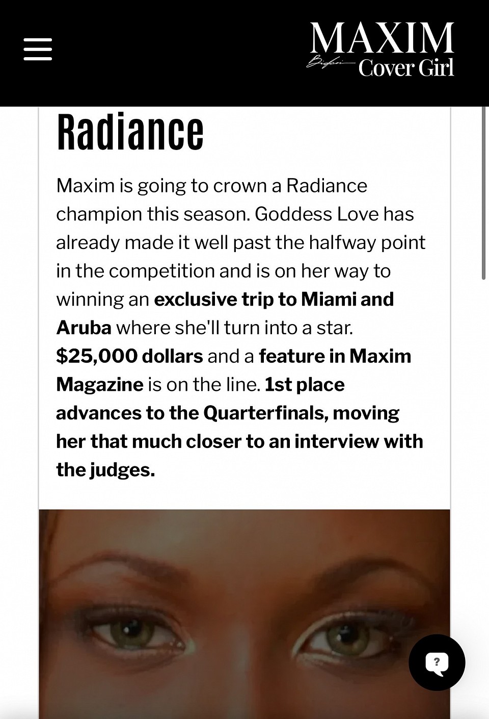 Support Goddess Love ,Vote Daily!! Every vote helps move Goddess Love forward in the Maxim Cover Girl competition toward a $25,000 cash prize, a feature in Maxim Magazine, and an exclusive Aruba experience. You can vote once per day, it’s fast, free,